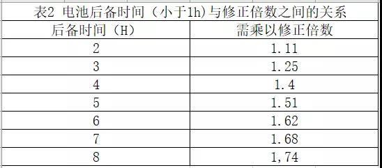 如果要求后备时间20min时: 则409/3=136Ah,还需乘以修正系数,见表1,136×1.41=192Ah,即可选12V、65Ah电池3组(32块/组)。 注意:实际后备时间超过20min(超出一点)。 其它情况,以此类推。 举列二: 2、对于126Ah•块/kVA电池容量的算法,一台120kVA的UPS,每组电池32块, 如果计算时间是一小时以上,要在按上述计算后再除以一个修正系数,见表2。