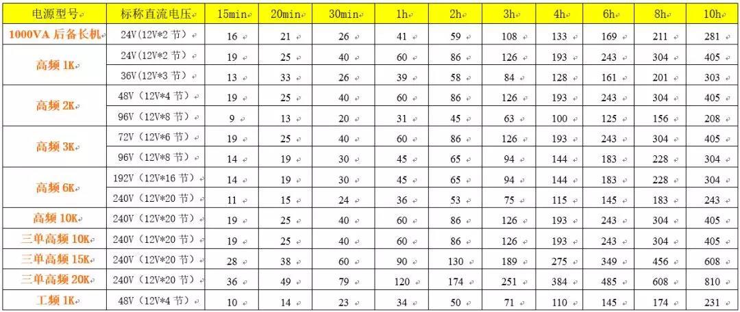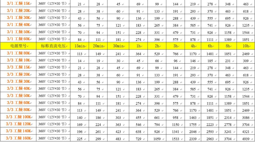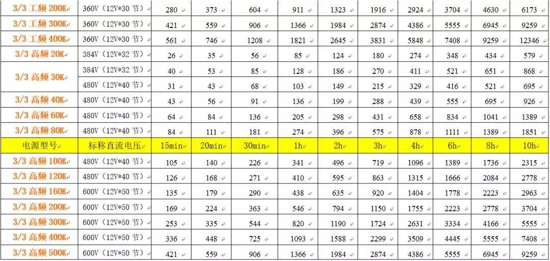 计算方法和需乘以修正系数与前述完全一样。 例如:前例的后备时间是3h: 则126×120=15120Ah•块, 13080/32=472Ah,472×3=1417Ah; 还需除一个修正系数,1417/1.25=1131Ah。 则需要配置即可选12V、300Ah电池4组(32块/组)。 按照能量守恒原理,以上方法对于三相/单相或单相/单相UPS是一样的。 一般中大功率的UPS所配每组电池都是32块;电池并联数最好不要超过4组,以免影响电池组的均流和充电效果。 以上是快捷的粗算,不是特别精确。要想得到精确的结果,应参照电池厂家给出的电池放电特性。 二、UPS电源延时配置表 关于上面的计算,虽然也比较简单,但是需要计算一两分钟,那么有没有更简单的方法,更简单的话就是直接看配置表了。 以下各系列机器所配置的蓄电池容量,是按照“电流法”进行配置,仅做参考! 采用电池临界点电压计算,计算结果与实际比较接近,这里面例出了大部分常用的配置表。