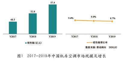 2019年,物联网、人工智能、云计算等信息技术与实体经济进一步融合,数据中心进入整合、升级、云化的新阶段,公有云服务市场兴起,行业数字化转型需求高涨,这些因素成为数据中心IT投资增长的主要动力,带动了数据中心建设需求,加快了大规模乃至超大规模数据中心建设,也拉动了中国机房空调市场需求。根据赛迪顾问统计,2019年中国机房空调市场规模为57.4亿元,同比增长8.7%,保持高速增长,见图1。