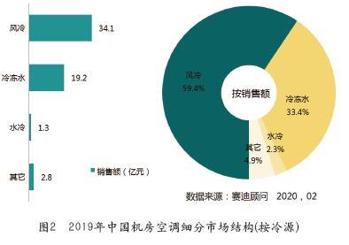 按照制冷冷源不同,机房空调可以分为风冷型、水冷型和冷冻水型。随着数据中心绿色节能、高密度、超大规模的发展趋势,特别是大型互联网企业的新建数据中心,传统风冷型制冷技术已经无法满足所需的散热能力,冷冻水型制冷系统在高效制冷和大制冷量方面的优势,推动了其较快推广。据赛迪顾问统计,从市场需求和销售额来看,风冷型制冷仍是目前机房空调中的主流机型,但冷冻水型制冷呈现较快增长趋势。2019年,风冷型机房空调市场销售额达34.1亿元,市场占有率为59.4%;冷冻水型机房空调市场销售额达19.2亿元,市场占有率为33.4%,见图2。