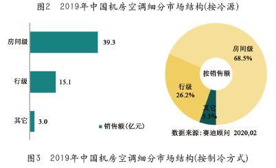 按照制冷方式不同,机房空调分为房间级、行级、机柜级等。从市场应用来看,由于房间级制冷的建设成本低、方便维护,传统数据中心和中小型数据中心常采用该制冷方式。随着新一代高密度计算和可变功率密度IT设备的应用,房间级制冷系统的制冷效率、性能等受到限制。为提升制冷效率、缩短气流路径,行级甚至机柜级等近端制冷方式逐渐在市场中使用。从数据中心发展趋势来看,随着数据中心边缘化、模块化发展,行级空调得到快速推广。根据赛迪顾问统计,2019年房间级机房空调仍然是市场的主流,其销售额达39.3亿元,市场占有率为68.5%,较2018年有所减少;2019年行级机房空调市场销售额达15.1亿元,市场占有率为26.2%,增长率达18.6%,见图3。