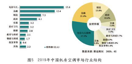 随着新一代信息技术与实体经济的深度融合,数字经济、智能经济推动各行业对数据中心的需求步入了一个新的阶段。电信与互联网、金融、制造业、政府等行业的数据中心需求,是拉动中国机房空调市场快速增长的主要动力。2019年,电信与互联网、金融、制造业、政府是机房空调最主要的应用行业,在交通、医疗卫生行业的应用比例也有大幅增长,见图5。