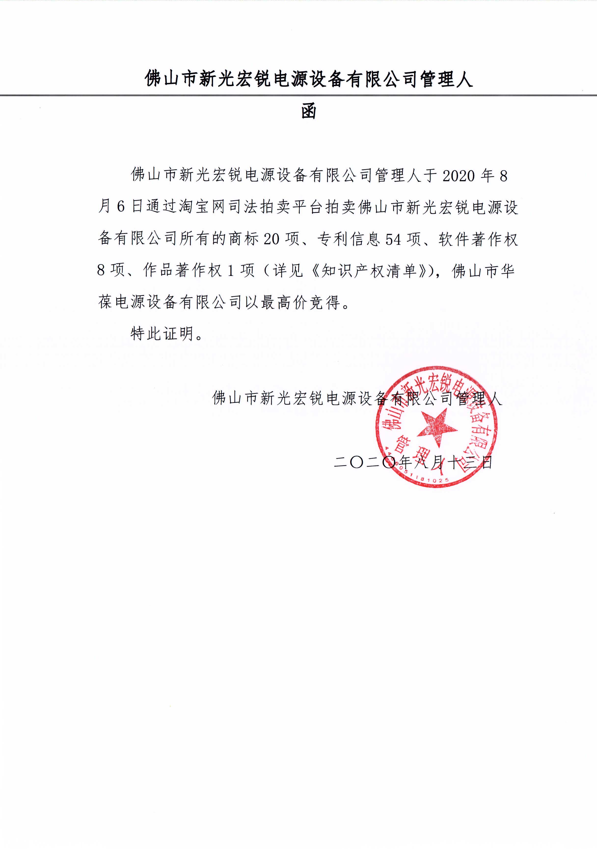:佛山市华葆电源设备有限公司2020年8月6日成功收购佛山市新光宏锐电源设备有限公司所有的商标20项、专利54项、软件著作权8项、作品著作权1项,具体详见《收购清单》。 自即日起,请市场立即停止未经授权许可以赢利为目的利用新光宏锐的商标、专利和知识产品进行市场推销、宣传的行为。如有违者,佛山市华葆电源设备有限公司将保留法律追诉的权利。 特此公告