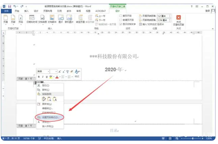 4、选中第一页的页码1,右键选中【设置页码格式】;
