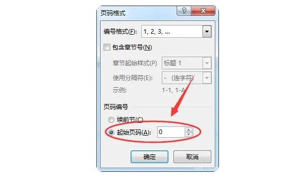 5、在打开的页码格式对话框中,将“起始页”设置为0,这时第一页的页码就变为0了,页第二页的页码就变成1了;
