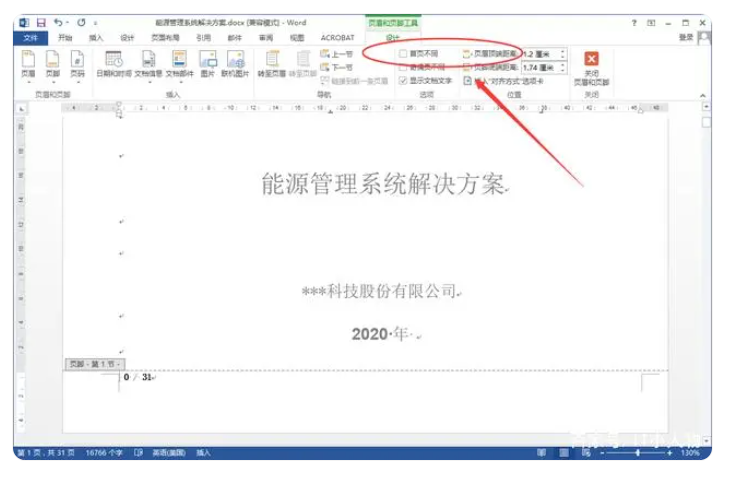 6、然后选中页眉页脚工具栏中的【首页不同】打勾,这样文档的第一页就不会显示页码0了,而第二页开始就显示为1。