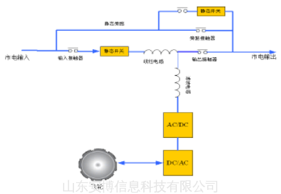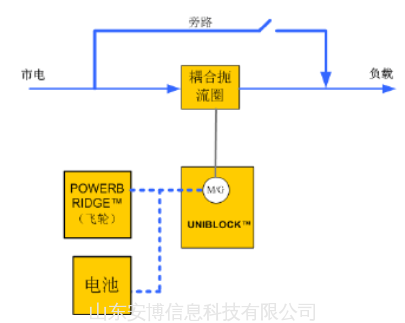 核心部件是M/G电动-发电机(UNIBLOCK™) ,市电正常时作为电动机带动飞轮(给飞轮充电),市电异常时飞轮放电,作为发电机,完全是机械式取代电力电子变 换,没有电力电子变换的精确控制,电网适应性和逆变出的质量会变差。