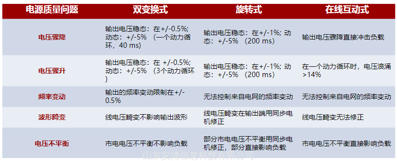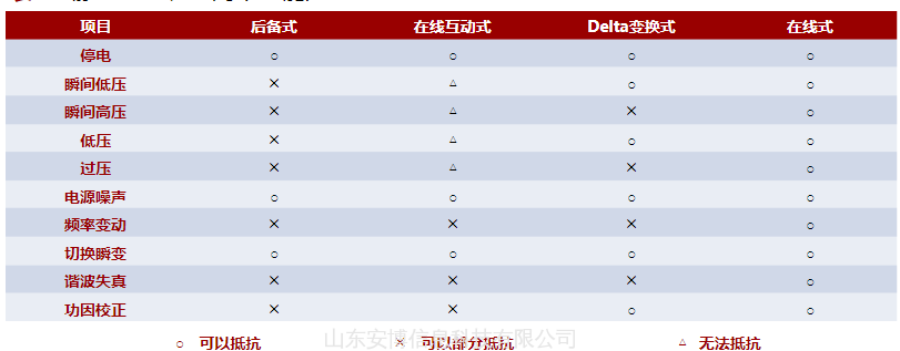 以上是三种比较典型的动态UPS,下面表格对这三种动态UPS抗电网干扰能力做一个简单的对比。