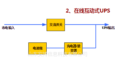 在线互动式UPS相比后备式而言,增加了稳压环节,供给负载改良过的市电。其成本低,电路比较简单,但是无法消除输入失真和干扰。并且切换时有转换时间。该架构应用于功率容量5KVA的以下的小容量UPS ,结构简单,通常是方波输出或模拟正弦波输出。多用于对PC或办公设备提供保护 。