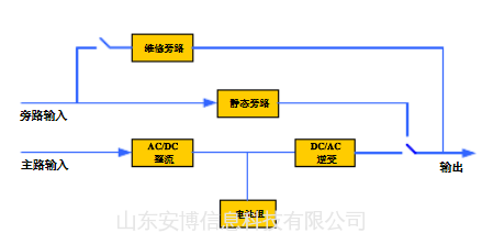 该架构多用于容量小于3KVA的UPS,结构简单,一般备电时间在10分钟左右,通常是方波输出,主要应用场景是PC机等。