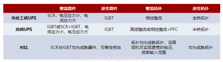 工频UPS在发展过程中,从SCR整流变为IGBT整流,并且不再使用隔离变压器。因此虽然从名称上看工频与高频是基于频率来命名,但是业内一般用有无隔离变压器来做区别。