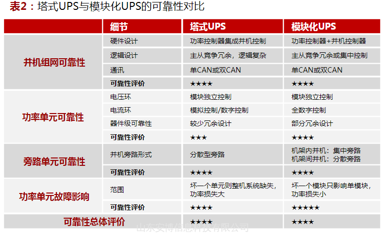 表2:塔式UPS与模块化UPS的可靠性对比