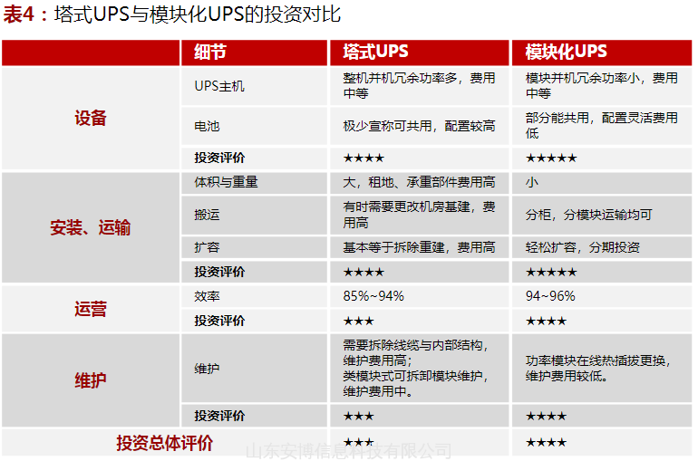 表4:塔式UPS与模块化UPS的投资对比
