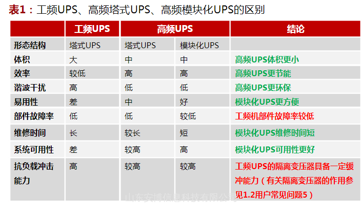 表1:工频UPS、高频塔式UPS、高频模块化UPS的区别