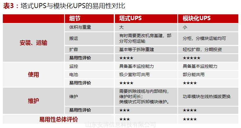 表3:塔式UPS与模块化UPS的易用性对比