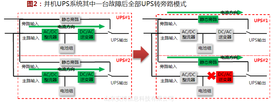 图2:并机UPS系统其中一台故障后全部UPS转旁路模式