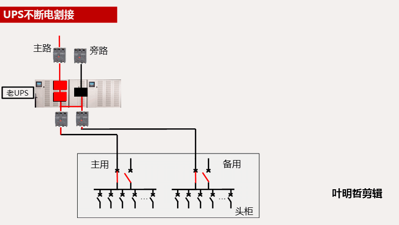 合新UPS主路输出,测试头柜主路备用空开上下端电压,进行核相操作(测量主用侧备用开关上下桩头电压差,原则小于1V),确认后可先合主用侧备用开关,进行电流确认,再断主用侧主用开关。