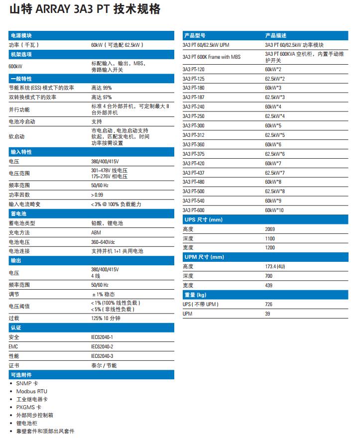600kW | 标配输入,输出,MBS,旁路输入开关 | 3A3 PT-180 | 60kW*3 | |